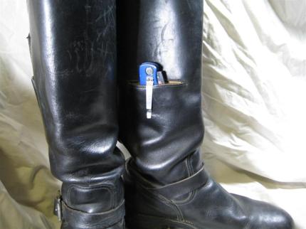 But on the whole, I have consistently come out on top. Below is a pair of tall, black, steel toes. There was no maker’s mark on these, but the vintage quality was evident. These were great boots. I wore them when riding my off-road dirt bikes. The high uppers protected me from the hot engine. The steel shank made kick starting my bikes a breeze. The right boot had a knife sheath and the left boot had a small utility pocket, great for a small tool or pistol. I bought them on eBay for $80.00. The only drawback is that they were tight in the ankles which made them heck to get on and off. When I finished with them, they auctioned for $185.00 and I shipped them to a buyer in England.
