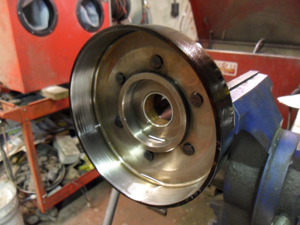 With the drum in the vise, I chuck the abrasive wheel in a drill and go to work smoothing out the grooves. Sorry, I don’t have a “before and after” shot, but I do have the pic below which shows the drum after. You can still see where the grooves were, but they are much less deep. I didn’t take it any further because I didn’t want to risk going too far and rendering the drum useless.